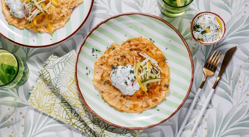 Мякоть свинины 300 гЯйцо куриное 3 шт.Масло растительное рафинированное Соль Перец чёрный молотый Чеснок сушеный Для подачи:Соус дзадзыки Овощи