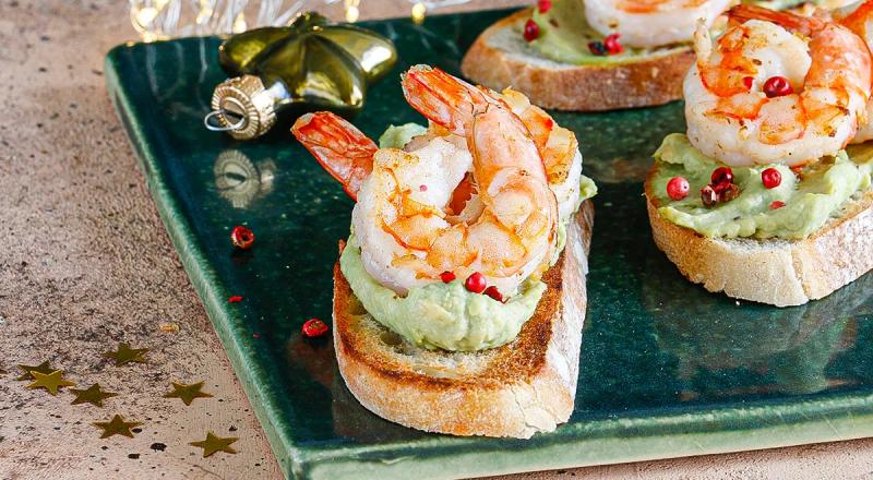 Простейшие брускетты с авокадо и креветками — это маленькие бутерброды на ломтиках багета, обжаренных до золотистой корочки, с кремом из авокадо с чесноком и лимонным соком и креветками. Такие брускетты станут прекрасной закуской для вашего праздничного стола, их удобно подать в составе фуршета, а приготовить проще простого, понадобится только хороший хлеб, спелое авокадо и заранее размороженные креветки, причем подойдут и сырые, и варено-мороженые.