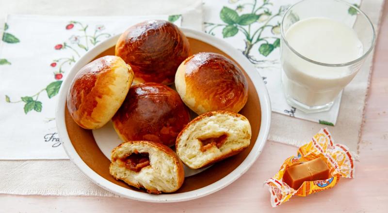 Дрожжевые булочки с конфетами – это пышные сдобные изделия, внутри которых спрятана сладкая тягучая начинка. Приготовление теста занимает львиную долю времени, но вот с начинкой нет никакой возни. Можно использовать желейные, карамельные или даже шоколадные конфеты. В отличие от повидла, варенья или другого жидкого ингредиента, конфетка никогда не вытечет из теста на противень и не пригорит, подпортив красоту булочек. В этом рецепте мы предлагаем приготовить сдобу с мягкими конфетами «Коровка». Благодаря им начинка получается, как сливочная помадка с карамельным ароматом.