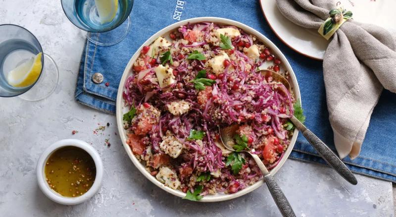 130 г киноа100 г краснокочанной капустыполовина грейпфрутаполовина граната2–3 веточки петрушки50 г сыра с голубой плесеньюДля заправки:4 ст. л. оливкового масла1 ст. л. гранатового сока1 ч. л. меда1 ч. л. горчицы1 ч. л. семян кориандрасоль