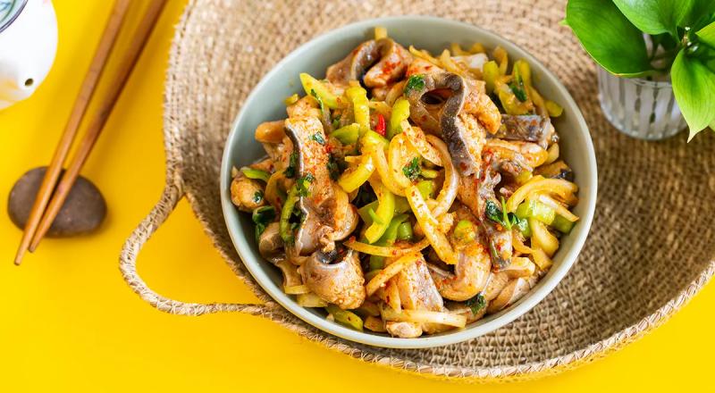 Для острой заправки разогрейте сковороду с растительным маслом, добавьте в нее треть нарезанного лука и обжарьте его в течение 3 минут до легкого золотистого оттенка. Затем добавьте перец кочукару, паприку, молотый кориандр и измельченный чеснок. Перемешайте и жарьте еще полминуты. Снимите сковороду с огня.