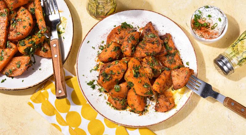 4Порции+Картофель сладкий (батат) 1 кгМасло растительное рафинированное 4 ст.л.Паприка копченая молотая 1 ч.л.Чеснок сушеный 1 ч.л.Куркума 1 ч.л.Петрушка 2 веточка(и)Соль по вкусуПерец чёрный молотый по вкусу