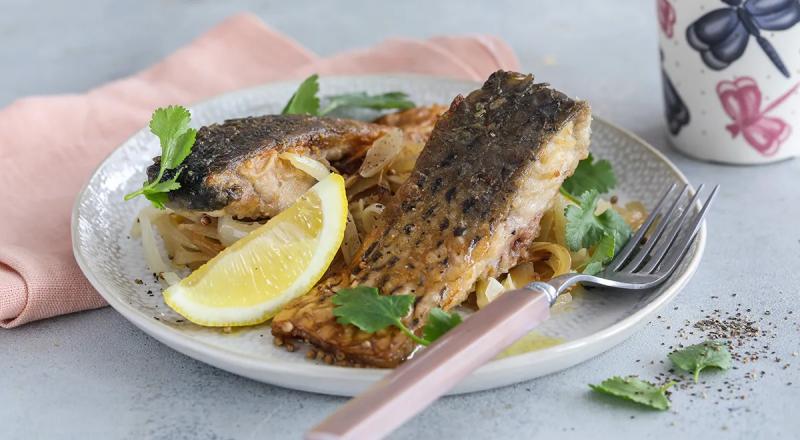 Жарьте рыбу со стороны кожи на средне-сильном огне до золотисто-коричневой корочки минуты 4, затем переверните кусочки на бок, начиная с того, который выложили в сковороду первым. Жарьте еще 3 минуты.