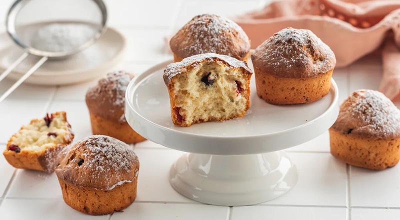 4Порции+Мука пшеничная 180 гСахар-песок 140 гСметана 20% (средней жирности) 100 гЯйцо куриное 2 шт.Вишня вяленая 30 гМасло растительное рафинированное 30 млСахар ванильный 1 ч.л.Разрыхлитель теста 1 ч.л.Соль 0.5 ч.л.Для посыпки:Сахарная пудра по вкусу