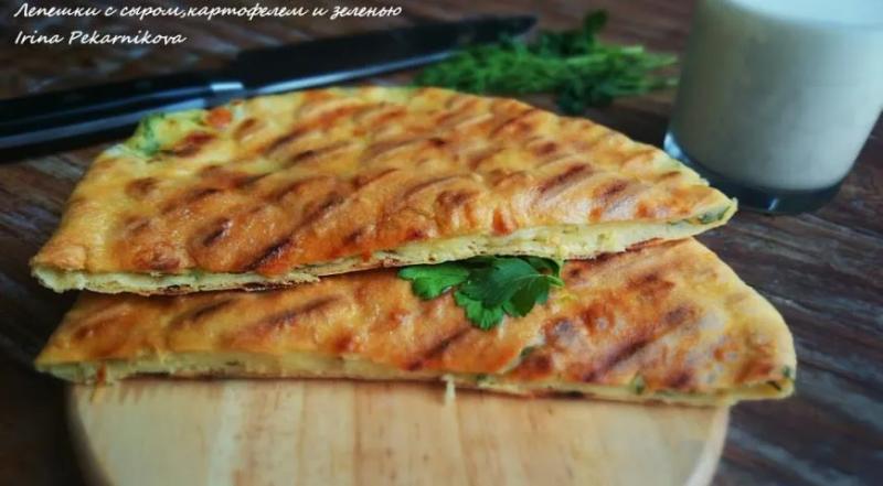 Лепешки с сыром, зеленью и картошкой по этому рецепту напомнят вам и осетинские пироги, и кутабы, и другие национальные варианты лепешек с начинкой. Это говорит только о популярности подобной еды. Ингредиенты простые и понятные, а вот сам процесс все же требует определенной сноровки. В наших лепешках будет много начинки, поэтому придется постараться раскатывать их аккуратно, чтобы тесто не порвалось. Но даже если это случится, большой трагедии не произойдет. Разве что расплавленный сыр слегка прижарится к сковороде. Сыр берите с ярким вкусом, чтобы он не потерялся в картошке. Хорошие варианты — сулугуни или брынза.