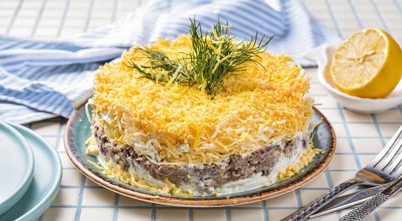 Выложите слой рыбы с луком на яичный слой. Покройте майонезным соусом. Натрите полутвердый сыр на мелкой терке, равномерно припорошите рыбный слой. Сделайте сеточку из майонеза.