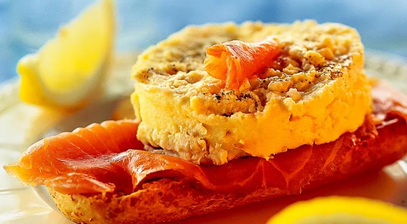 Распределите по хлебу с маслом ломтики слабосоленого лосося (один отложите и нарежьте тонкими полосками). Сверху уложите теплый омлет. Украсьте оставшимся лососем, свернутыми, например, в виде розочек.