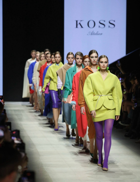 День открыла яркая новая коллекция Ольги Коссински — смелая игра с цветовыми сочетаниями, на которую решится не каждый. Лимонный встретился с сиреневым, коралловый ответил приглушённым ментоловым, бирюзовый — молочным. На этом фоне классические песочный и чёрный стали точкой равновесия. Весеннее настроение смягчило крой: шифоновые юбки А-силуэта, жакеты с О-образными рукавами, бахрома и перья, кружево напротив тиснёной кожи — коллекция вышла богатой на текстуры и неожиданные решения.