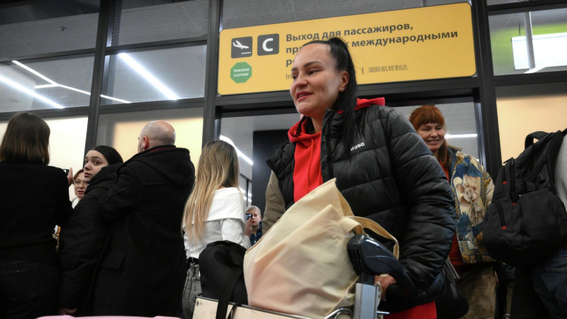 Пассажиры на выходе из зоны прилета международных рейсов в аэропорту Шереметьево