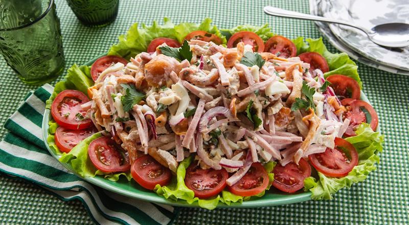 Салат «Мужская мечта» носит столь красивое название совершенно заслуженно. Уверены, что если вы приготовите это блюдо по нашему рецепту, то ваши близкие, особенно представители сильного пола, по достоинству оценят простое, но очень удачное сочетание курицы, ветчины, яиц и маринованных грибов. Эстеты же отметят и симпатичную подачу салата — на зеленых хрустящих листьях в обрамлении кружочков красных помидоров. Кстати, если хотите усилить впечатление, приготовьте блюдо порционно, разложив ингредиенты в соусе по небольшим тарелкам: это подчеркнет ваше внимание к личности каждого сидящего за столом.