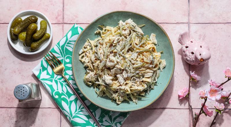 Отварное филе куриной грудки растрепите на волокна. Маринованные огурчики нарежьте тонкой длинной соломкой. Соедините в салатнике лапшу из яичных блинчиков, курицу, маринованные огурцы и жареный лук.