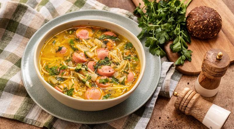 От супа с сосисками и вермишелью веет ностальгией. Это незатейливое первое блюдо готовили хотя бы однажды в каждой советской семье. Сосиски в супе играют важную роль, поэтому выбирайте качественный продукт без сои и ароматизаторов. Сливочные или молочные придадут блюду нежный аромат; куриные варятся очень быстро и идеально подойдут для диетического или детского питания; сырные сделают суп гуще и добавят бульону кремовости; копченые же подарят ему приятный дымный аромат. Простой рецепт приготовления супа ждет вас!