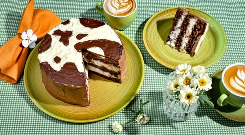 Традиционно торт «Милка» украшают «островками» темного и белого крема — они символизируют пятнистую окраску коровы. Приготовьте два вида крема. Растопите темный шоколад и добавьте сливочное масло комнатной температуры, перемешайте, остудите. Растопите белый шоколад, добавьте масло, перемешайте, остудите и хорошо взбейте, чтобы он стал светлым.